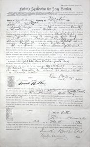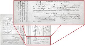 Example 1: Parental consent to enlist: The law required that a volunteer for service in the Civil War who was under the age of 18 must provide permission from a parent to enlist. A soldier’s service record will often include a copy of his enlistment record and on the back of that document is a section entitled “Consent in Case of Minor”. When completed, that section will typically contain the name and signature of at least one parent.