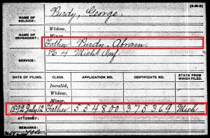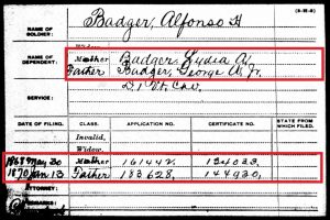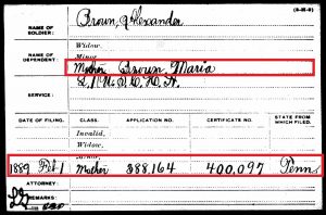Example 3: The pension index card for the soldier’s parent(s): U.S. soldiers were paid for their service by the government and many soldiers would send that money home to support his family. If a soldier was killed in service (or died later due to a wound or disease that was acquired in service), then any direct family member who could prove that he/she was dependent on the money from the soldier to survive could apply for his pension benefits.